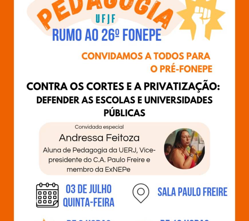 Na próxima quinta-feira, 03 de julho, a Faculdade de Educação da Universidade Federal de Juiz de Fora (UFJF) será palco de um importante momento de mobilização e resistência: o Pré-FONEPE, evento preparatório para o 26º FONEPE. Com o tema central “Contra os cortes e a privatização: defender as escolas e universidades públicas”, a atividade visa fortalecer a luta coletiva contra o desmonte da educação pública … Continuar lendo [MG] Estudantes de Pedagogia da UFJF promovem Pré-FONEPE com debate combativo em defesa da educação pública, gratuita e a serviço do povo!