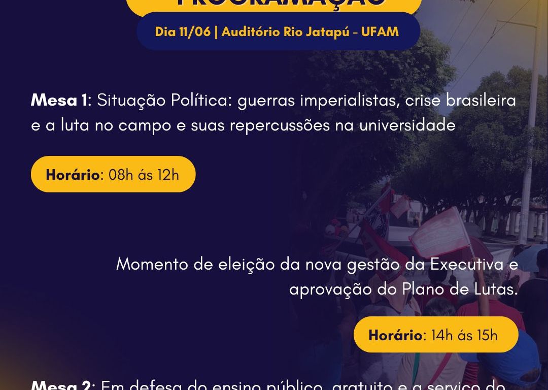 A programação iniciará às 8h com a discussão sobre a conjuntura nacional e internacional, abordando as guerras imperialistas, a crise brasileira, a luta no campo e seus reflexos nas universidades. À tarde, às 14h, será realizada a eleição da nova gestão da Executiva Amazonense de Estudantes de Pedagogia e a aprovação do Plano de Lutas. Encerrando o encontro, às 15h, será realizada a mesa em defesa do ensino público, gratuito e a serviço do povo, com foco nos cortes de verbas e na ameaça de privatização das escolas e universidades.