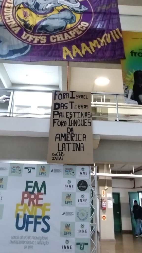 A Comissão de Fundação da Executiva Catarinense de Estudantes de Pedagogia (ExCEPe) junto ao Movimento Pela Libertação Palestina – Ghassan Kanafani, Comitê de Apoio do Jornal A Nova Democracia de Chapecó, SINDTAE, Humana Sebo e Livraria, Coletivo Estudantil Jataí e outras entidades realizaram um cine debate no dia 28 de maio de 2025 na UFFS – Campus Chapecó. O documentário passado foi “No Other Land” (Sem chão), que venceu o Oscar de Melhor Documentário de Longa-Metragem em 2025.
