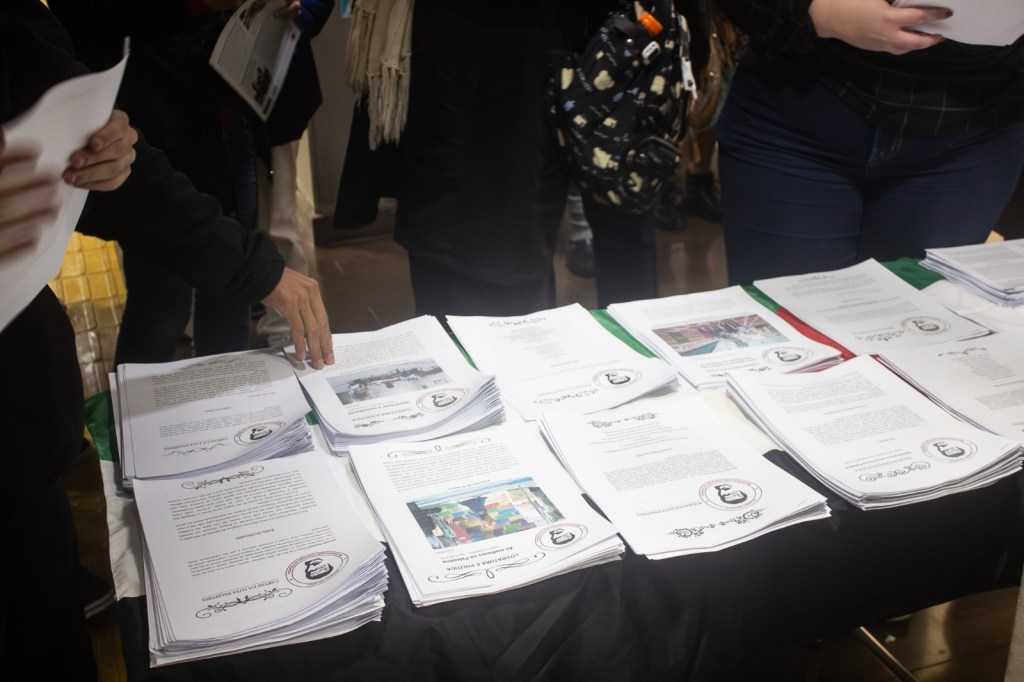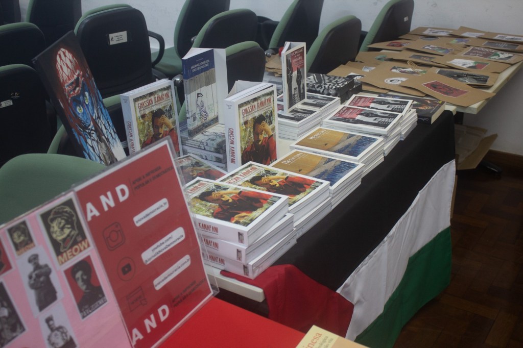 Na entrada do evento foram disponibilizados gratuitamente textos feitos pelo MLP – Ghassan Kanafani e textos que o Dr. Yasser fez para o Jornal A Nova Democracia. E dentro do auditório o Comitê de Apoio do Jornal A Nova Democracia montou sua banquinha com jornais e livros junto ao MLP – Ghassan Kanafani.