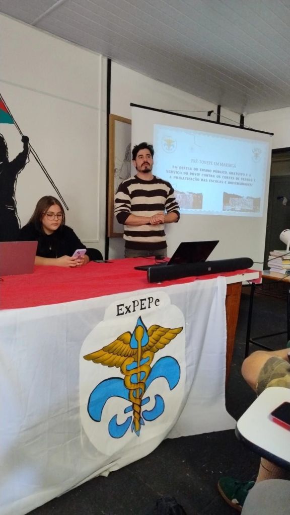 No dia 19/07 (sábado), na sede do DCE da Universidade Estadual de Maringá, ocorreu o Pré-FoNEPe, que contou com as Executivas do Paraná, São Paulo, Comissões de Fundação das Executivas de Santa Catarina e Rio Grande do Sul, o DCE UEM Presente, DCE da Universidade Federal Fronteira Sul (UFFS, Laranjeiras do Sul), CAPED da UEM, CEPED da USP, Movimento Maruí, Coletivo Estudantil Jataí e o Comitê de Apoio ao Jornal A Nova Democracia de Maringá. Após uma calorosa recepção, foram abordados assuntos importantes às executivas e movimentos estudantis combativos no que tange a luta pela educação pública em nosso país, além da necessidade de organização e enfrentamento ao oportunismo. O evento reuniu cerca de 30 estudantes e foi extremamente vitorioso na preparação das delegações para o 26º FoNEPe, que teve como tema “Em Defesa do Ensino Público, Gratuito e a Serviço do Povo! Contra os Cortes de Verbas e a Privatização das Escolas e Universidades!”, realizado em Belém, do Pará, nos dias 25, 26 e 27 de julho.