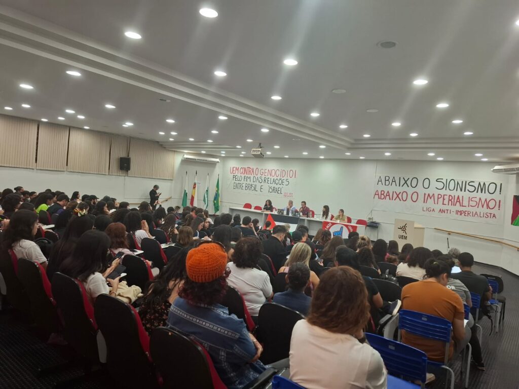 O auditório 29 de Abril do Bloco I-12 da Universidade Estadual de Maringá ficou lotado para receber a palestra do presidente da Federação Árabe Palestina do Brasil (FEPAL), Ualid Rabah, durante a noite da última quinta-feira (28) sobre o tema “Pelo fim do genocídio palestino e das relações entre Brasil e Israel”. Mais de 170 pessoas participaram, entre estudantes, professores, ativistas e membros da comunidade árabe de Maringá, ultrapassando o número de assentos disponíveis. Professores do curso de Pedagogia, inclusive, liberaram suas turmas para assistirem à atividade, reconhecendo a relevância do tema.