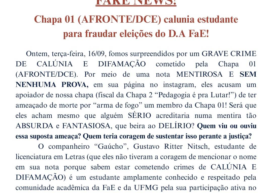 Ontem, terça-feira, 16/09, fomos surpreendidos por um GRAVE CRIME DE CALÚNIA E DIFAMAÇÃO cometido pela Chapa 01 (AFRONTE/DCE). Por meio de uma nota MENTIROSA E SEM NENHUMA PROVA, em sua página no Instagram. Eles acusam um apoiador de nossa chapa (fiscal da Chapa 2 “Pedagogia é pra Lutar!”) de ter ameaçado de morte por “arma de fogo” um membro da Chapa 01! Será que eles acham mesmo que alguém SÉRIO acreditaria numa mentira tão ABSURDA e FANTASIOSA, que beira ao DELÍRIO? Quem viu ou ouviu essa suposta ameaça? Quem teria coragem de sustentar isso perante a justiça? O companheiro “Gaúcho”, Gustavo Ritter Nitsch, estudante de licenciatura em Letras (que eles não tiveram a coragem de mencionar o nome em sua nota porque sabem estar cometendo crimes de CALÚNIA E DIFAMAÇÃO) é um estudante amplamente conhecido e respeitado pela comunidade acadêmica da FaE e da UFMG pela sua participação ativa no movimento estudantil em defesa dos interesses dos estudantes, contra os cortes de verba, em defesa da assistência estudantil, dos vendedores ambulantes da FaE, em solidariedade ao povo palestino e em apoio à luta pela terra dos camponeses, quilombolas e indígenas. Está claro para todos QUE QUEREM VER que se trata de uma MANOBRA OPORTUNISTA que tem por objetivo IMPEDIR QUE NOSSA CHAPA CONCORRA AS ELEIÇÕES. Tanto é que, poucas horas após a publicação da referida nota MENTIROSA, membros do AFRONTE/DCE, que aparelharam a “junta eleitoral”, publicaram na página do Instagram do D.A. da FaE uma nota ameaçando IMPUGNAR nossa Chapa 2 “Pedagogia é pra Lutar!”.
