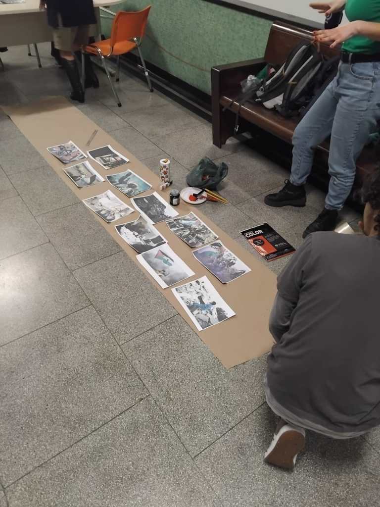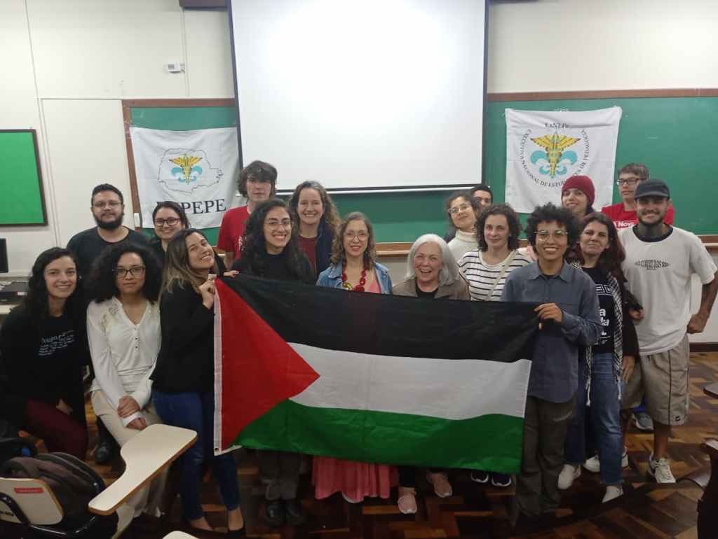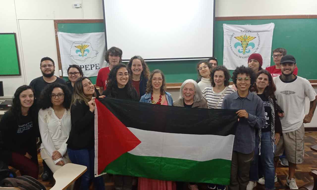 No ultimo dia da II Semana Acadêmica foi realizado um sarau com diversas apresentações organizadas pelos estudantes. A representante da ExPEPe aproveitou o momento para realizar a leitura de “Poema em Gaza” escrito por Ana Nascimento e convidou a todos a construir um mural em homenagem a luta do povo palestino.