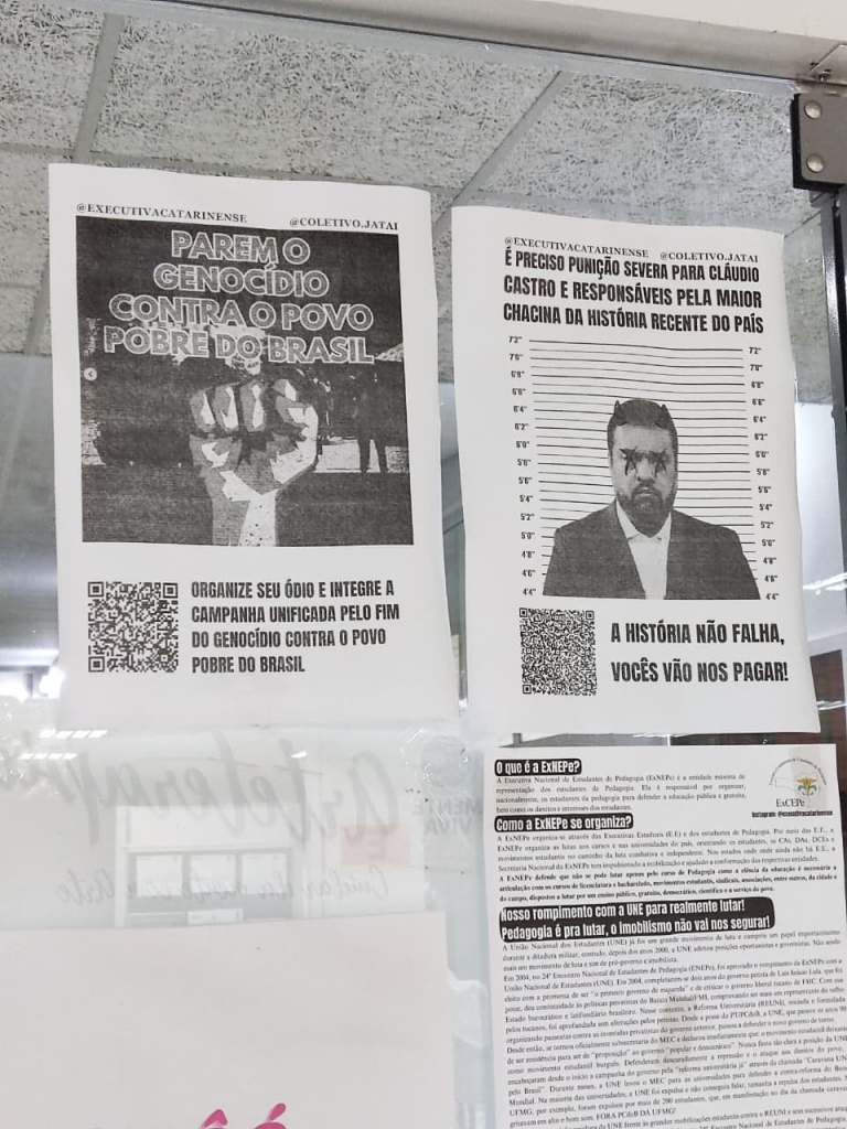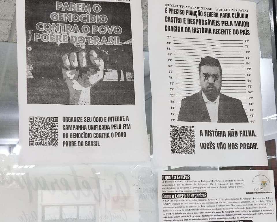 Somando-se às mobilizações nacionais de denúncia contra a crescente violência policial no país, a Executiva Catarinense de Estudantes de Pedagogia (ExCEPe), em conjunto com o Coletivo Jataí, realizou no dia 31 de outubro, na UFFS – Campus Chapecó, uma colagem de cartazes em todos os blocos da Universidade. A ação se mostrou como uma necessidade em resposta à chacina ocorrida nos complexos da Penha e do Alemão, no Rio de Janeiro, no dia 28 de outubro, e como um ato de denúncia contra o governador genocida e criminoso do estado do Rio de Janeiro, Cláudio Castro.