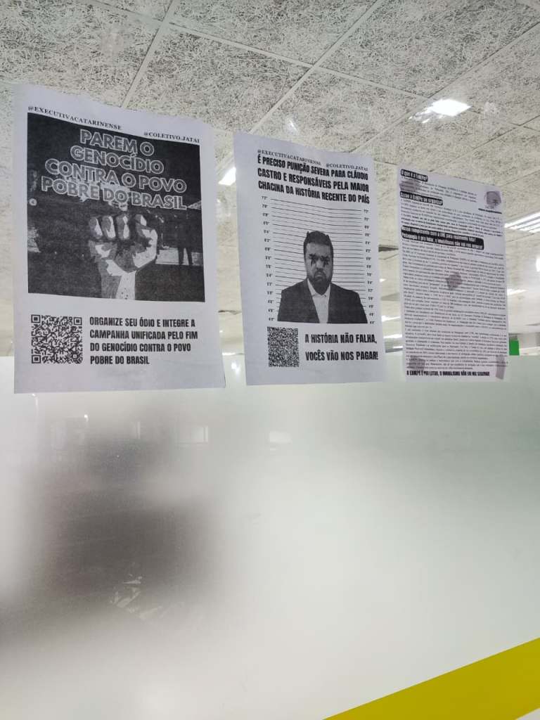 Os cartazes fixados contém mensagens de denúncia e cobrança de responsabilização pelo massacre. Os dizeres continham: “É preciso punição severa para Cláudio Castro e responsáveis pela maior chacina da história recente no país” e “A história não falha, vocês vão nos pagar”. Outro cartaz cotinha um chamado para mobilização política, afirmando: “Organize seu ódio e integre a Campanha Unificada pelo Fim do Genocídio contra o Povo Pobre no Brasil”. Ademais, o cartaz apresenta um QrCode que aponta para a matéria do jornal A Nova Democracia sobre o caso e outro para o instagram da Campanha Unificada.
