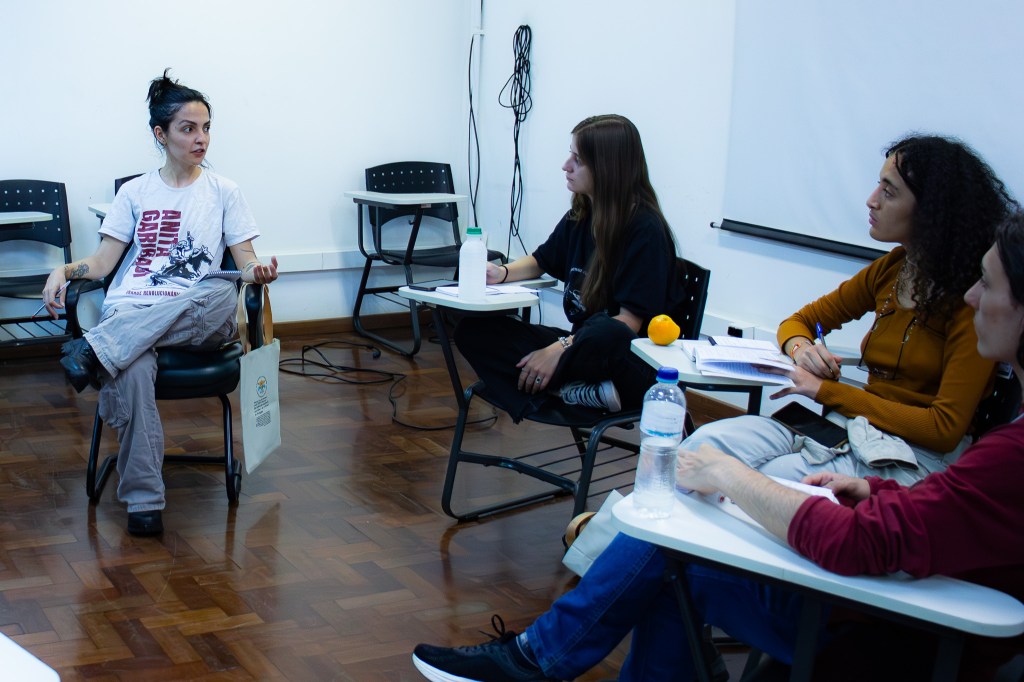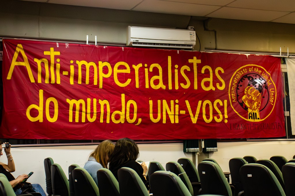 A representante do Jornal A Nova Democracia abriu a fala demonstrando a crise imperialista que se expressa em todo o planeta através da sua economia parasitária e em decomposição. Pontuando a contradição entre trabalho vivo e trabalho morto, na forma de maquinário autômato, ressaltou que a substituição daquele por este aumenta a miséria da classe laboriosa, reduzindo seus salários, diminuindo as garantias de emprego e os jogando para as prisões do capital financeiro, com créditos a juros criminosos. Consequentemente, gera-se a luta incessante pelo aumento da margem de lucro e a diminuição do consumo, pois a maioria da população mundial tem suas condições de vida cada vez mais exploradas e miseráveis. É um receituário certeiro para a revolta dos povos oprimidos pelo capitalismo — em particular, no próprio coração da besta imperialista hegemônica — o que podemos verificar nos levantes multitudinários contra as políticas de expulsão dos imigrantes dos Estados Unidos da América. Em esfera internacional, foi destacada a transcendental resistência do povo palestino frente à ponta de lança imperialista no Oriente Médio, ou seja, o Estado colonial genocida de “Israel”. Na região do Sahel, a luta pela libertação da França imperialista, liderada por Burkina Fasso, também foi pontuada. No Brasil, por fim, destacou-se a luta nacional anti-imperialista, que tem sua principal força nos camponeses pobres sem terra ou com pouca terra, lutando com unhas e dentes contra o latifúndio — lacaio do imperialismo, principalmente ianque, em nosso país. Velho latifúndio envernizado de agronegócio, que domina o território nacional para extrair o máximo de lucro com o mínimo de custo, através do monopólio de terras usadas para monocultura e pastagem em escala continental. Junto ao Estado, como sua bancada de negócios, aliado ao capital financeiro e burocrático, busca garantir apenas a infraestrutura básica para o escoamento de toda a produção dessa atrasada economia feudal e colonial, como a construção da Ferrogrão e da Transamazônica.