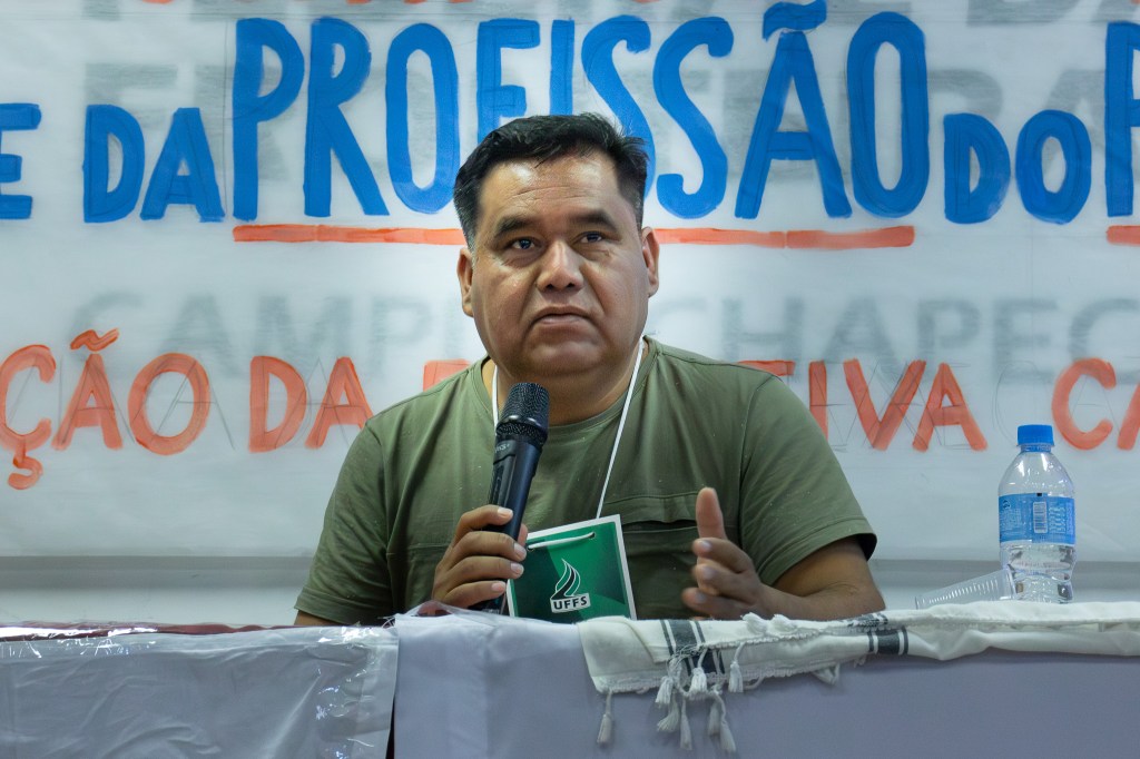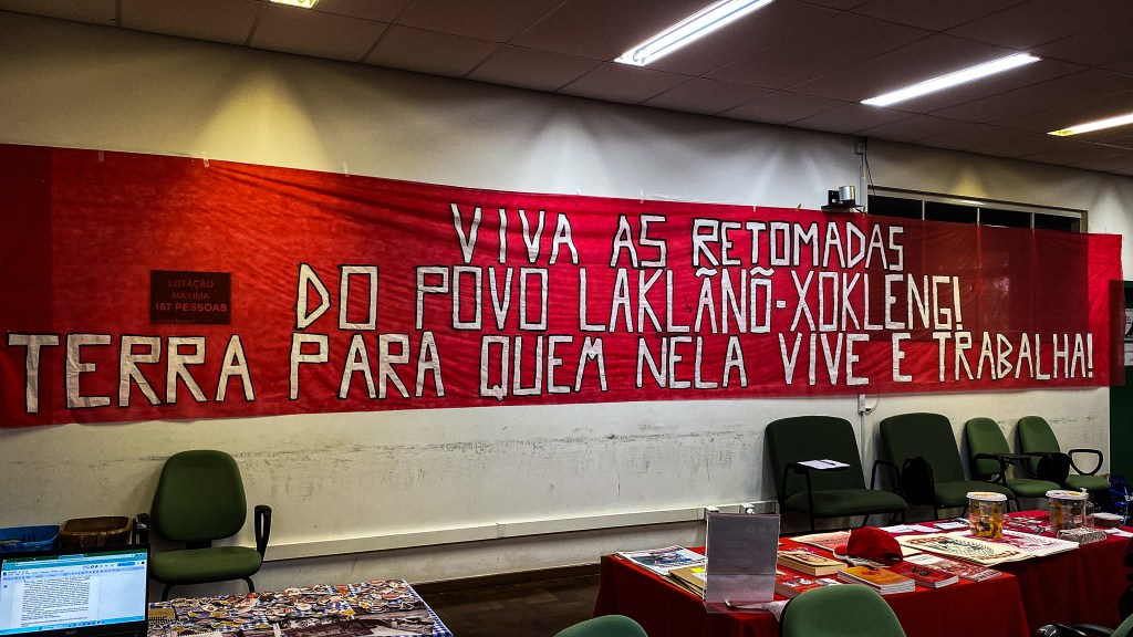 Em um segundo momento da mesa, o Cacique Laklãnõ-Xokleng destacou a importância dos movimentos de retomadas dos territórios indígenas. Ele cita duas retomadas do povo Laklãnõ-Xokleng, uma em Três Barras e outra em Blumenau, onde atua como cacique. Também mencionou as retomadas do povo Kaingang, lembrando que são numerosas e destaca que essas ações fortalecem a luta pelo território e pela autodeterminação dos povos. Durante sua fala, cita um território localizado em José Boiteux, um espaço pequeno e entre montanhas que abriga mais de cinco mil Laklãnõ que precisam de um espaço digno para agricultura e moradia. O cacique nos denuncia que, na década de 1970, grandes empreendimentos tomaram o espaço de agricultura desse povo; entre as construções está a maior barragem de contenção de cheias do Brasil, que deixa o território do seu povo mais isolado e exposto a perigos. Samuel afirma que o sistema é o principal causador de problemas e que ele precisa acabar. A fala do cacique também foi marcada pela demonstração de solidariedade ao povo palestino, fazendo paralelos à situação dos povos originários brasileiros, que após a invasão europeia não tiveram mais paz e tiveram suas casas e territórios roubados através da brutal violência. Ao encerrar, destaca que vê na juventude a força para promover as mudanças necessárias para acabar com o sistema.