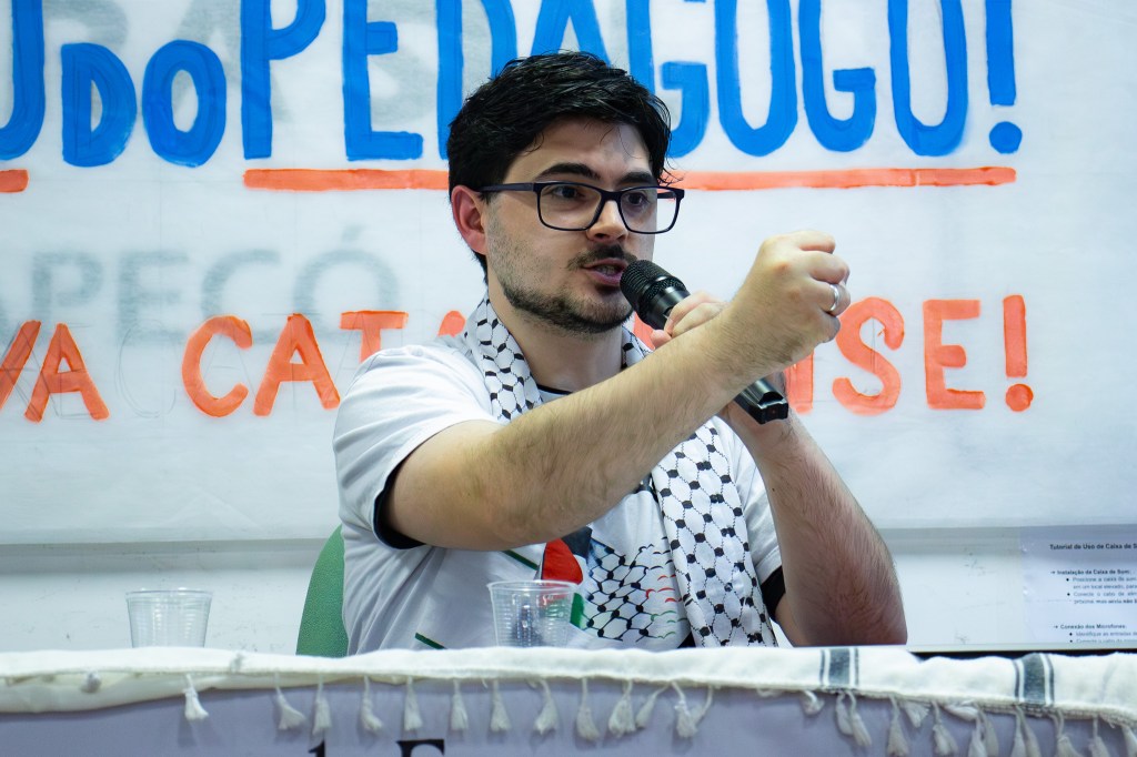O representante da Frente Palestina Livre de Santa Catarina fez uma exposição da situação política internacional. Durante a sua fala, ele denuncia a falta de insumos médicos na Faixa de Gaza pelo bloqueio imposto por “israel”, que restringe a entrada de alimentos, medicamentos e ajuda humanitária. Ele cita brevemente o exemplo do movimento das Flotilhas que tentaram romper, levando ajuda humanitária, o bloqueio marítimo imposto por “israel”. Destacou que cerca de 80% dos habitantes da Faixa de Gaza são descendentes de palestinos que refugiados após as invasões sionista em 1948 e 1967, sendo hoje a terceira e quarta geração que foram transformados em refugiados dentro do seu próprio território. Em sua fala, criticou a proposta de criação de dois Estados, afirmando que tal medida representa a tentativa de consolidar um “marco temporal” na Palestina, apagando o direito histórico do povo palestino sobre seu território e destacou mais uma vez que a Palestina é única e legítima, e que não existe, e nem existirá, uma identidade israelense. Mencionou ainda a situação na Cisjordânia, denunciando a destruição das oliveiras, o roubo das colheitas e a luta da população palestina pela posse e uso das suas terras. Citou ainda o número alarmante de jornalistas palestinos assassinados e com dados e registros recentes, lembrou que “israel” matou mais de 20 mil estudantes e destruiu todas as universidades da Faixa de Gaza. Encerrando sua fala, o representante defendeu a união entre os povos originários do Brasil e o povo palestino, que compartilham a mesma determinação, a de não abrir mão de sua terra e de sua história diante da colonização imperialista, traçando paralelos entre os genocídios cometidos em Auschwitz, na Palestina e com os Yanomammis no Brasil, destacando a semelhança das violências impostas. Ressaltou que a causa palestina se alinha às lutas de outros povos oprimidos, pois é também uma luta pela terra, pela vida e pela sobrevivência, mostrou também vídeos de palestinos que, mesmo em meio à devastação, não perdem a sua fé, resistência e confiança que irão reconstruir o território com as próprias mãos, mostrando e reafirmando que resistir é a forma mais profunda de viver.