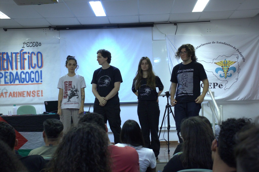 A programação cultural do 1º Encontro Catarinense de Estudantes de Pedagogia (ECEPE) reuniu poesia, música e teatro trazendo a cultura popular para o encontro. A abertura ficou por conta do professor Luiz Carlos de Freitas, da Universidade Federal da Fronteira Sul (UFFS), que envolveu o público com duas músicas apresentadas em voz e violão, dando início à noite cultural. Em seguida, Mansour Salum, declamou uma poesia que conectou arte e política, reafirmando a luta internacional dos povos. Logo depois, o estudante Andrei de apresentou uma poesia autoral. Foi apresentado um teatro autoral sobre a ocupação da reitoria de 2025, em Chapecó, que resgatou a memória de luta dos estudantes e reforçou o papel histórico da mobilização na defesa da universidade pública. A noite também contou com duas apresentações musicais compostas pelos estudantes durante a viagem ao Fórum Nacional das Entidades de Pedagogia (FONEPe), realizado em Belém do Pará, na metade do ano. Ao final de todas as apresentações, os estudantes cantaram juntos mais 2 músicas que demonstram a luta do povo em defesa dos seus direitos como a educação e o direito à terra.