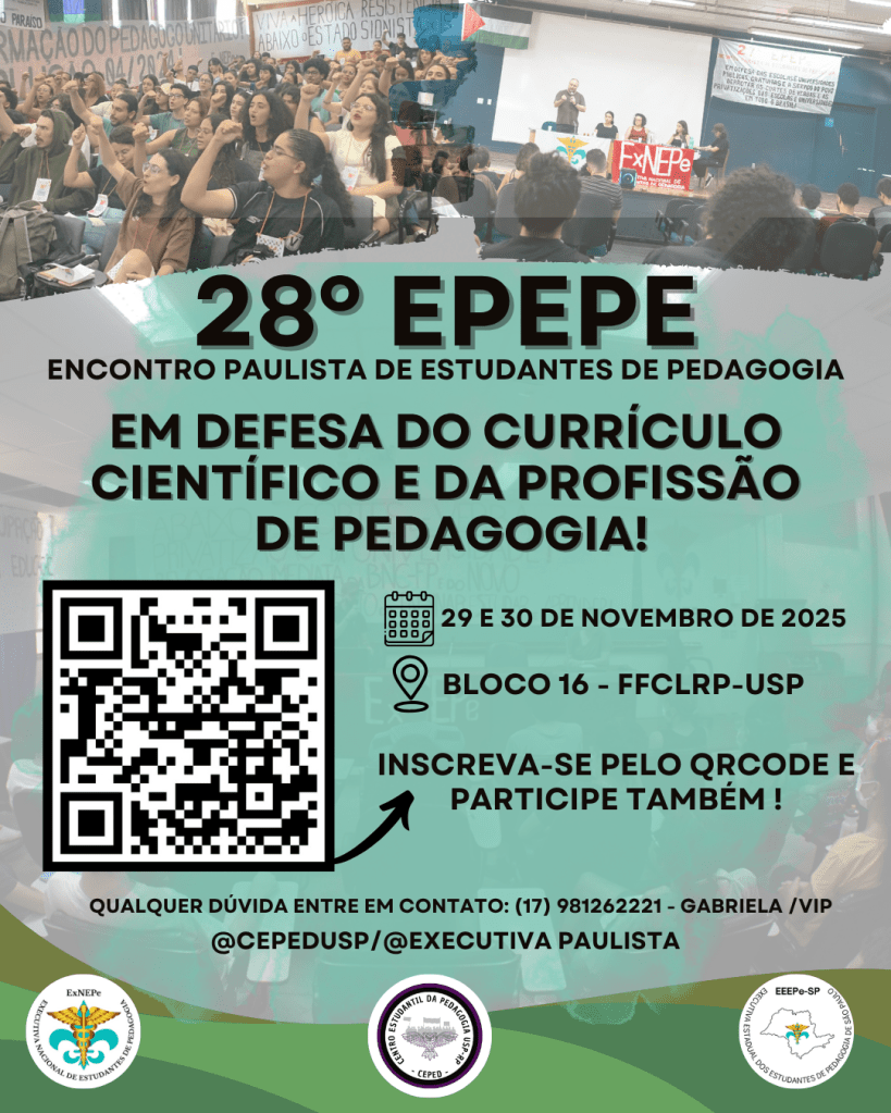 Essa mesma chama de resistência esteve acesa na USP de Ribeirão Preto, universidade que sediará o 28° Encontro Paulista de Estudantes de Pedagogia. Em 2022, o curso de pedagogia enfrentou um grave processo de sucateamento e, pela falta de docentes, correu o risco de fechamento. Em resposta, os estudantes se organizaram e, durante uma semana, ocuparam o bloco em que tem suas aulas. Coincidentemente, esse é o mesmo bloco onde acontecerão as mesas e palestras do EPEPe. Se hoje o Encontro Paulista de Estudantes de Pedagogia acontecerá na USP de Ribeirão Preto, é graças à combatividade e ao êxito dessa vitoriosa ocupação.