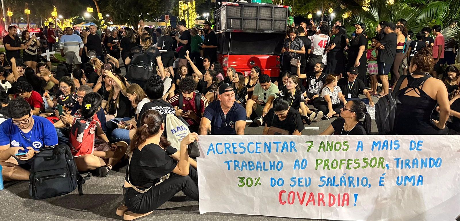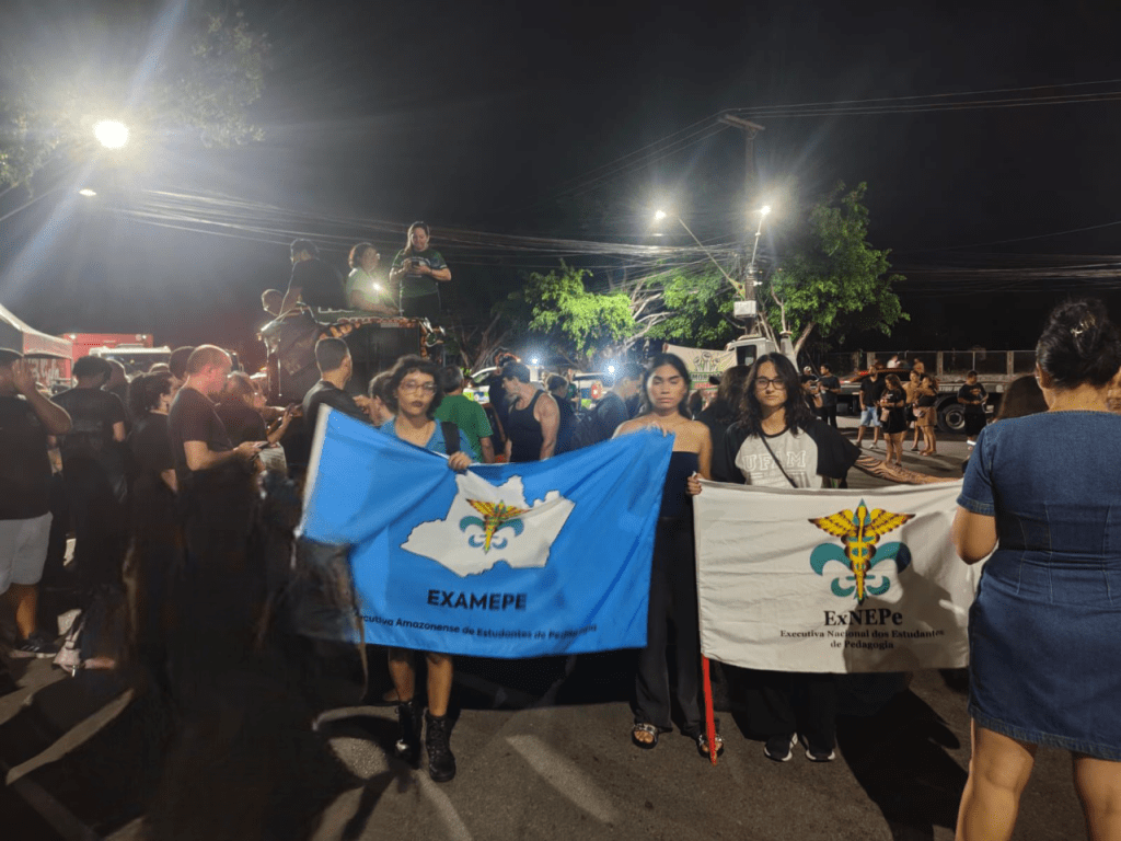 A Executiva Amazonense de Estudantes de Pedagogia esteve ontem, 20/11/2025, na Ponta Negra, junto aos professores e professoras no ato contra o PL 08/2025, chamado pela categoria de PL da morte e aprovado no dia 17/11. O protesto aconteceu no mesmo local e horário da inauguração do festival de Natal do prefeito, e justamente por isso o governo tentou impedir a presença da categoria.