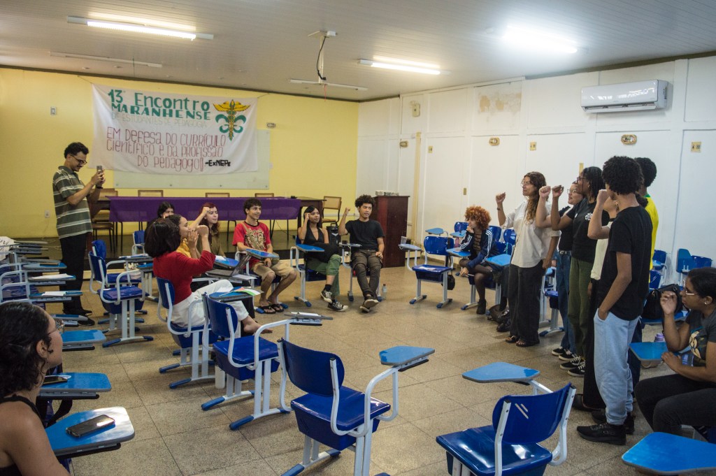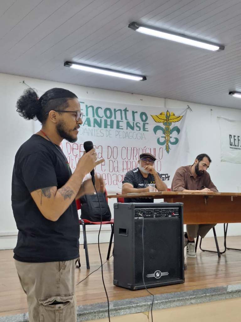 No sábado (22), segundo dia do evento, ocorreu, pela manhã, a mesa em formato de roda de conversa intitulada “Do currículo às práticas pedagógicas: em defesa da profissão do pedagogo”, que contou com a presença do professor Érbio Santos (UFMA) e de Rebeca Rodrigues, vice-presidente da Executiva Nacional dos Estudantes de Pedagogia. A atividade abriu um dia marcado por debates, avaliações políticas e construção coletiva entre estudantes da capital e do interior do estado.