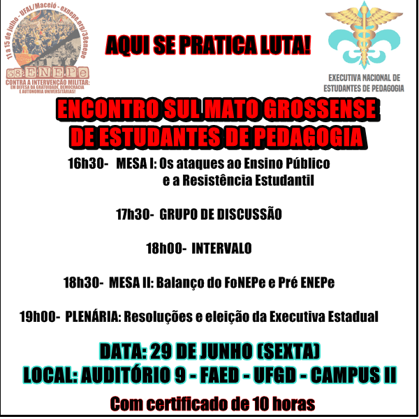 No dia 29 de junho foi realizado o histórico 1º Encontro Sul-Mato-Grossense de Estudantes de Pedagogia na UFGD, em Dourados. Além da universidade citada, o evento contou com a participação do Universidade Estadual de Mato Grosso do Sul. Cerca de 40 estudantes e professores marcaram presença a fim de fortalecer a luta estudantil no estado, debatendo acerca do desmonte da universidade pública. Na abertura do … Continuar lendo Histórico 1º Encontro Sul-Mato-Grossense de Estudantes de Pedagogia!